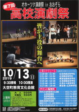 | ■日 時 : 2019年10月13日(日) 10:00開演(9:30開場) ■会 場 : 大空町教育文化会館 ■料 金 : 全席自由(税込) 大人 500円 中高生 300円 ※小学生以下は無料です。 ※入場券1枚で全ての学校演劇公演をご覧いただけます。 半券をお持ちであれば、再入場は自由です。 ※車椅子席には限りがありますのでご了承ください。 ※会館前駐車場はスペースが限られております。 お車でお越しの際は周辺の公共駐車場をご利用ください。 |